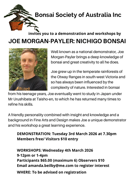 Well known as a national demonstrator, Joe Morgan-Payler brings a deep knowledge of bonsai and great creativity to all he does. Joe grew up in the temperate rainforests of the Otway Ranges in south-west Victoria and so has always been influenced by the complexity of nature. Interested in bonsai from his teenage years, Joe eventually went to study in Japan under Mr Urushibata at Taisho-en, to which he has returned many times to refine his skills.