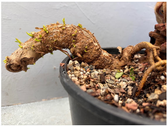 I’m not suggesting a wholesale repotting at the wrong time of year but with good care it has not set this apprentice bonsai back at all. Once the shoots develop into branches the aspect of the fig will change and the DD label will no longer be appropriate but it tickles my sense of humour now.
